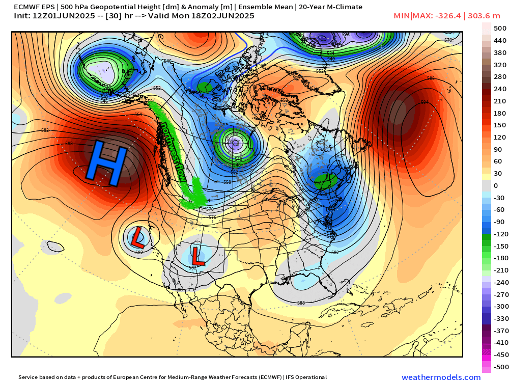 This is the main weather pattern as we go into Monday and Tuesday this week. A few things to note – the H over the Pacific, which is locking in the coolest air to our north. This persistent ridging has left Colorado in a predominantly northwest flow pattern. That can commonly lead to daily afternoon shower and storm chances like we've seen much of this week, especially around the Palmer Divide and southeast Colorado.