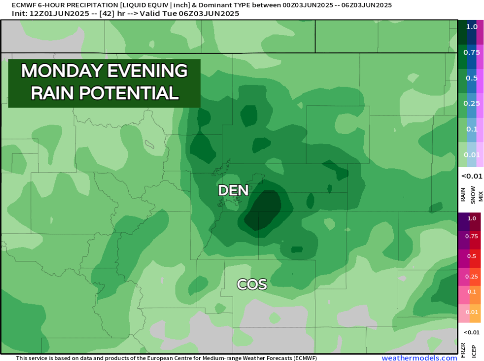 There's been some back and forth with respect to HOW MUCH rain might fall. Earlier this weekend it seemed that heavier amounts might prevail, but latest modeling has backed off a touch... We'll have to watch the progression of this system closely, but for now, meaningful moisture is still on the table. We'll also have to be on the lookout for some nocturnal severe weather with this set up, so make sure you have a way to get alerts Monday night – hail and damaging wind would likely be the biggest threats, especially east of I-25.