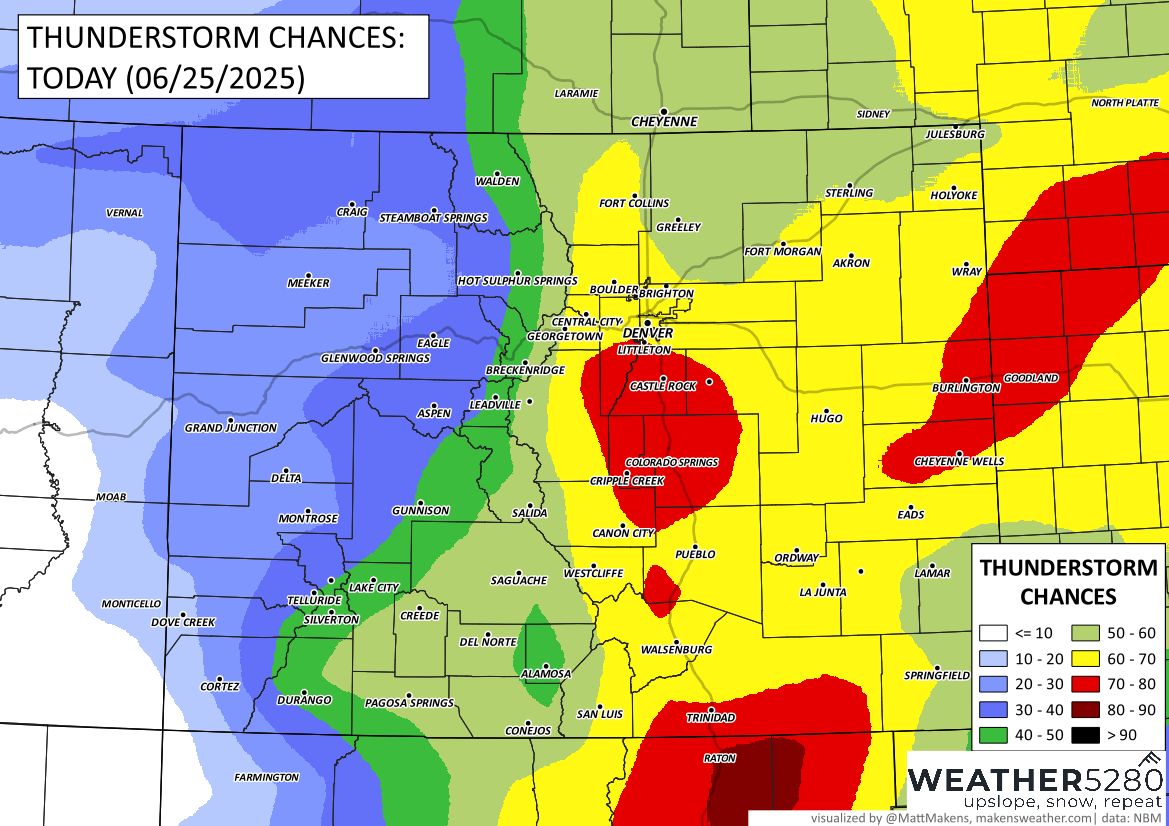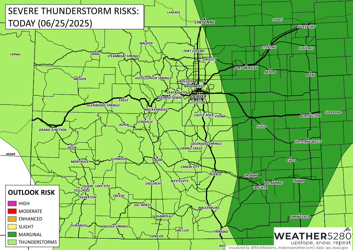 While most storms will bring brief heavy rain and lightning, a few could become strong to severe, especially east of I-25. If you're out and about this afternoon, be aware of the potential for hail up to 1 inch and gusty winds up to 60 mph. The highest risk for severe weather stretches into the southeastern plains later in the day. Keep an eye on the sky and have a way to receive alerts if you're out during the drive home.